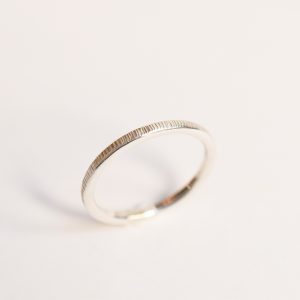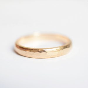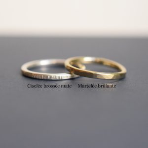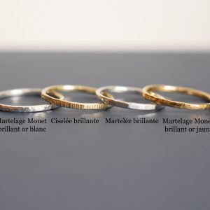 Chaque texture est réalisée à la main. La texture lisse est la plus commune et intemporelle. Le ciselage consiste dans le fait de fait de très légères stries verticales dans le métal qui va diffuser la lumière pour répartir la brillance sur l’anneau. Le martelage est le fait de frapper la surface du métal avec un marteau. Cette texture va apporter un effet de facettes pour accentuer la brillance. Le martelage Monet est très similaire à la différence que les facettes vont être bien plus petites. Son nom « Monet » fait donc référence à la technique de peinture de cet artiste impressionniste. Le martelage Monet accroche encore plus la lumière pour donner une brillance supplémentaire à l’alliance.