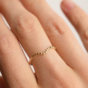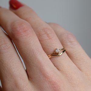 Les alliances courbées sont des alliances réalisée avec un fil d’or en forme de jonc, donc rond. Elles sont courbées sur l’avant de la bague de sorte à pouvoir être portées avec une autre bague de type solitaire (comme une bague de fiançailles) en s’emboîtant parfaitement. Cela crée un ensemble homogène, moderne, confortable et très esthétique. Pour que les deux bagues s’harmonisent parfaitement, il faut bien choisir l’épaisseur de l’anneau pour ne pas que l’alliance soit étouffée par la bague de fiançailles et vice versa.