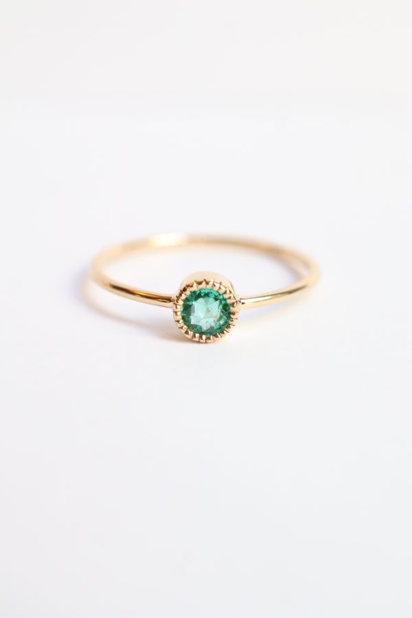 Au cœur de cette création d’exception se trouve une émeraude naturelle de 4 mm, en provenance de Colombie sélectionnée pour sa teinte verte intense et sa lumière caractéristique. Symbole de renouveau et d’harmonie, l’émeraude, ici de taille brillant, capte la lumière avec douceur, offrant un éclat subtilement miroitant. Son serti millegrain raffiné encadre la pierre avec délicatesse, apportant une touche de caractère au design épuré de la bague.