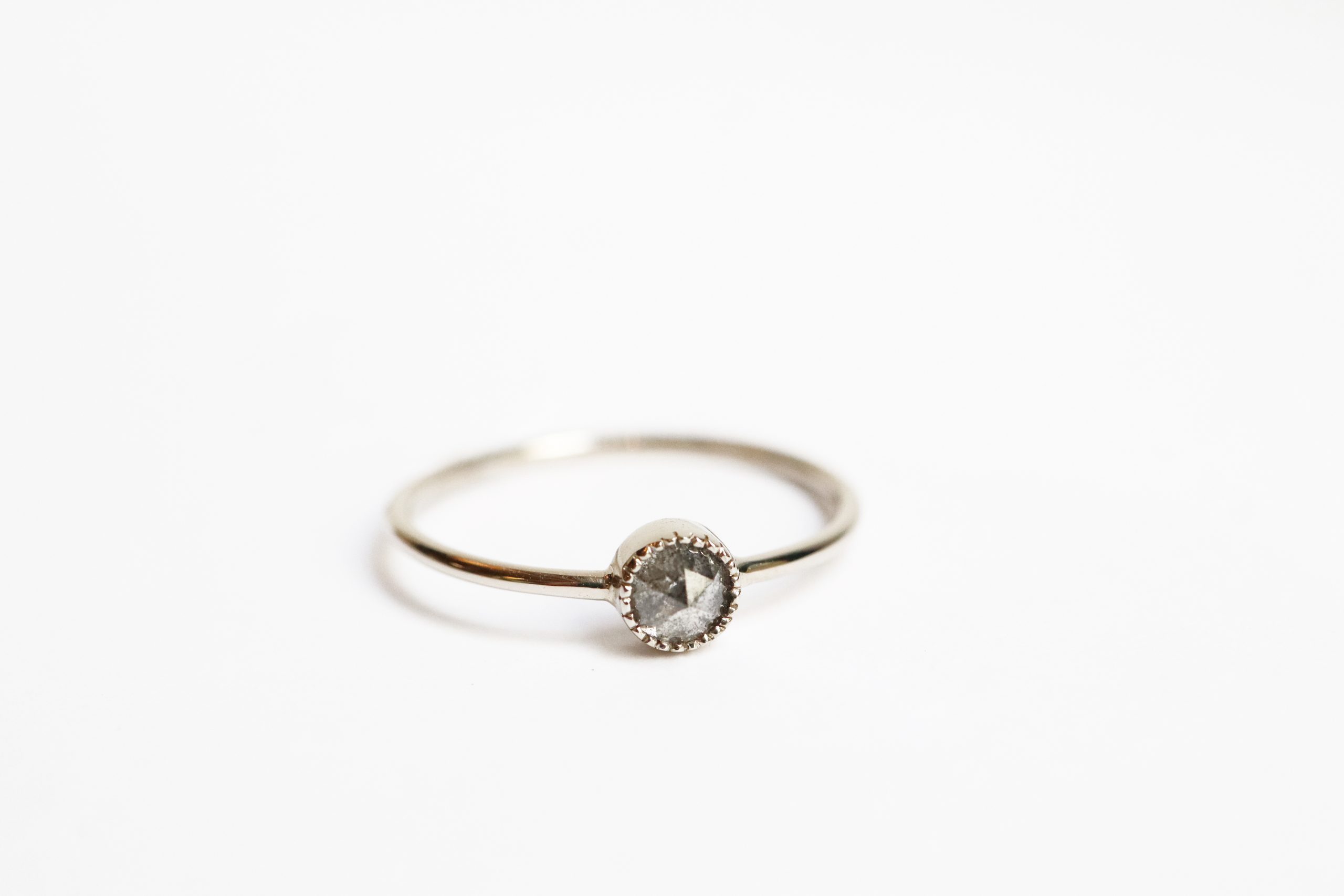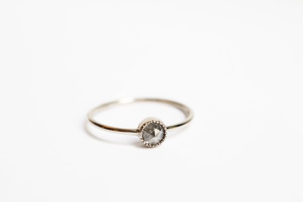 Découvrez la bague Ainay diamant gris, un bijou d’exception alliant la pureté de l’or 18 carats recyclé et l’éclat d’un diamant gris unique. Ce modèle intemporel et raffiné se distingue par un design élégant, où l’anneau fin de 1mm met en valeur un diamant gris rosecut unique, sur un serti millegrain pour un effet vintage et délicat.