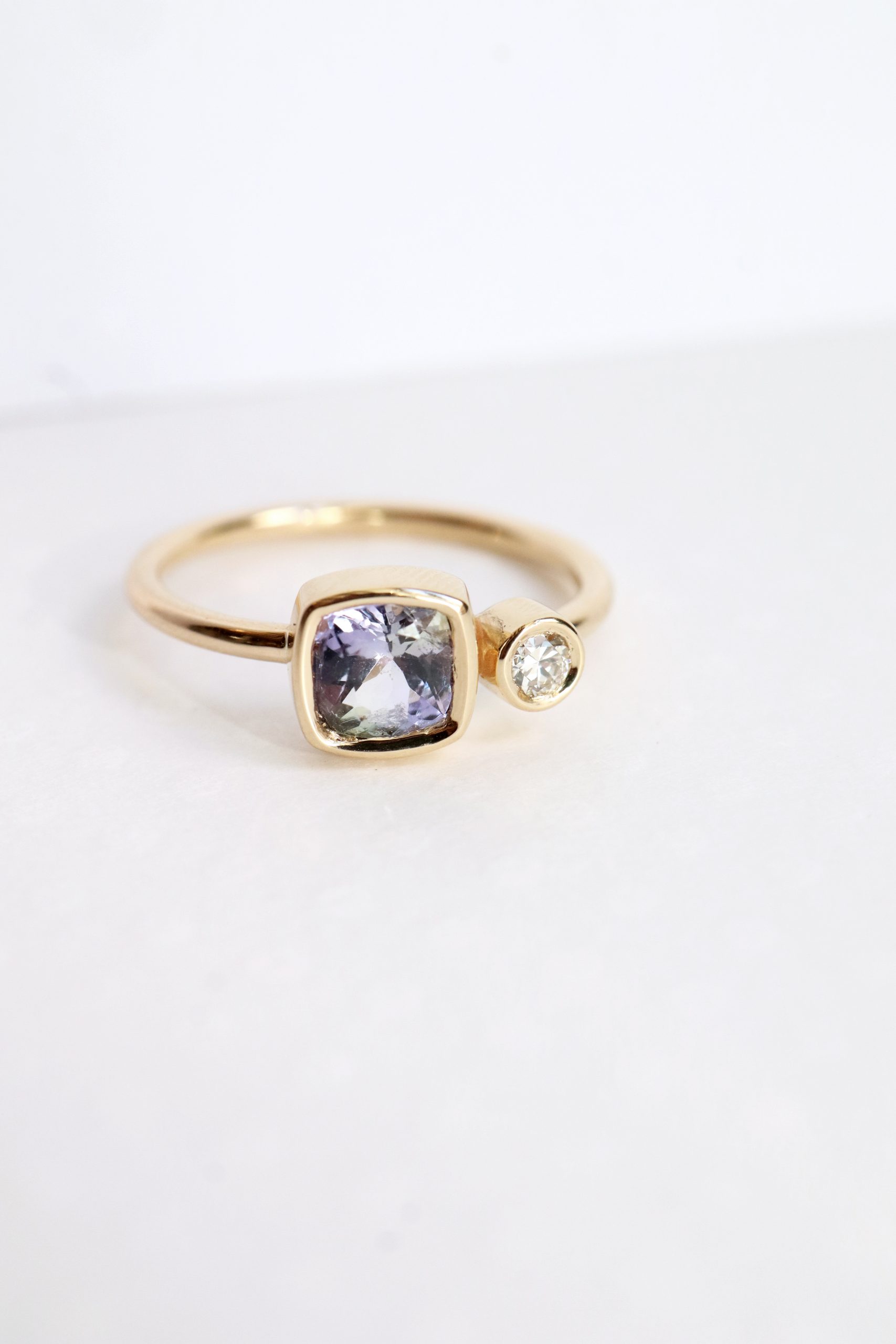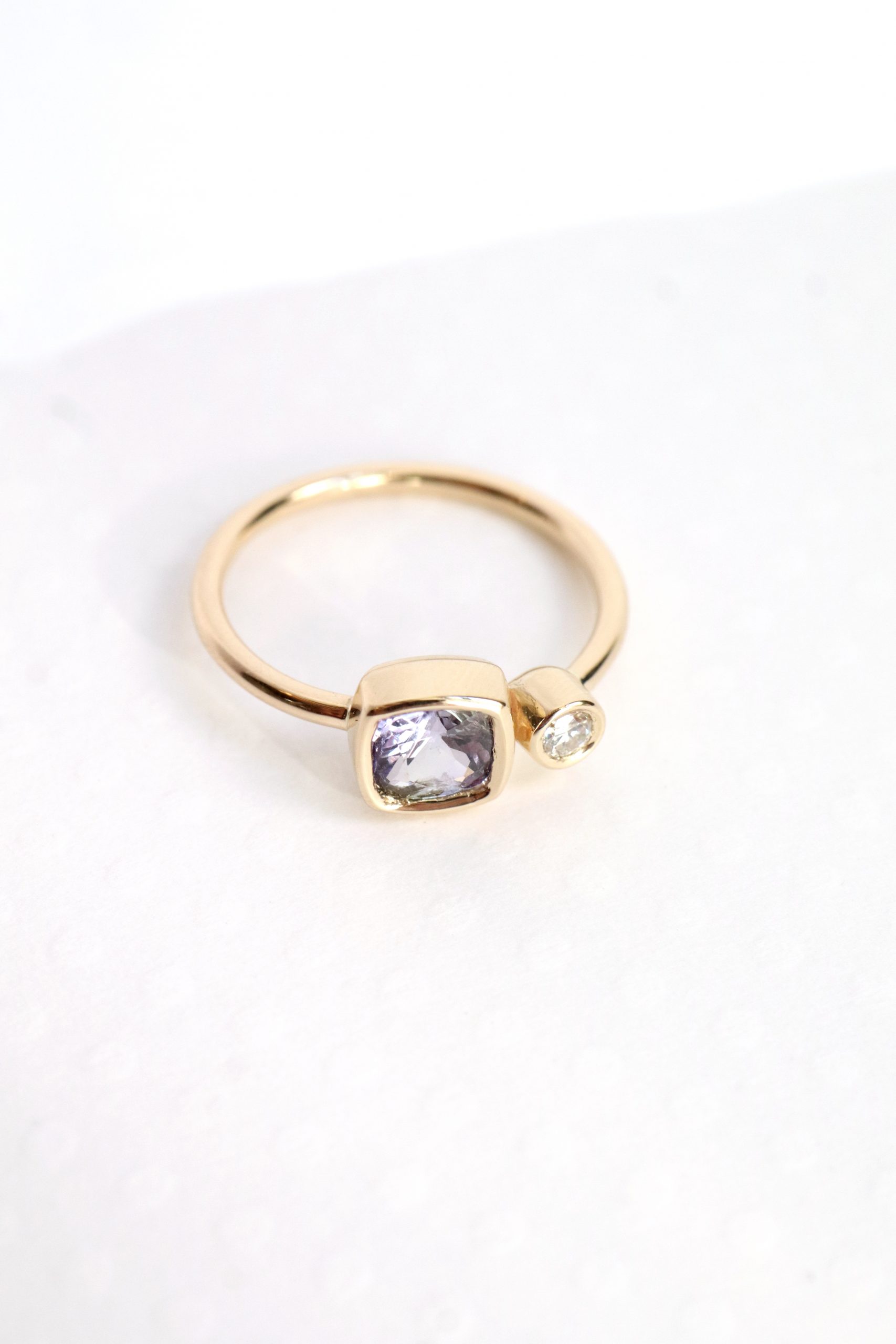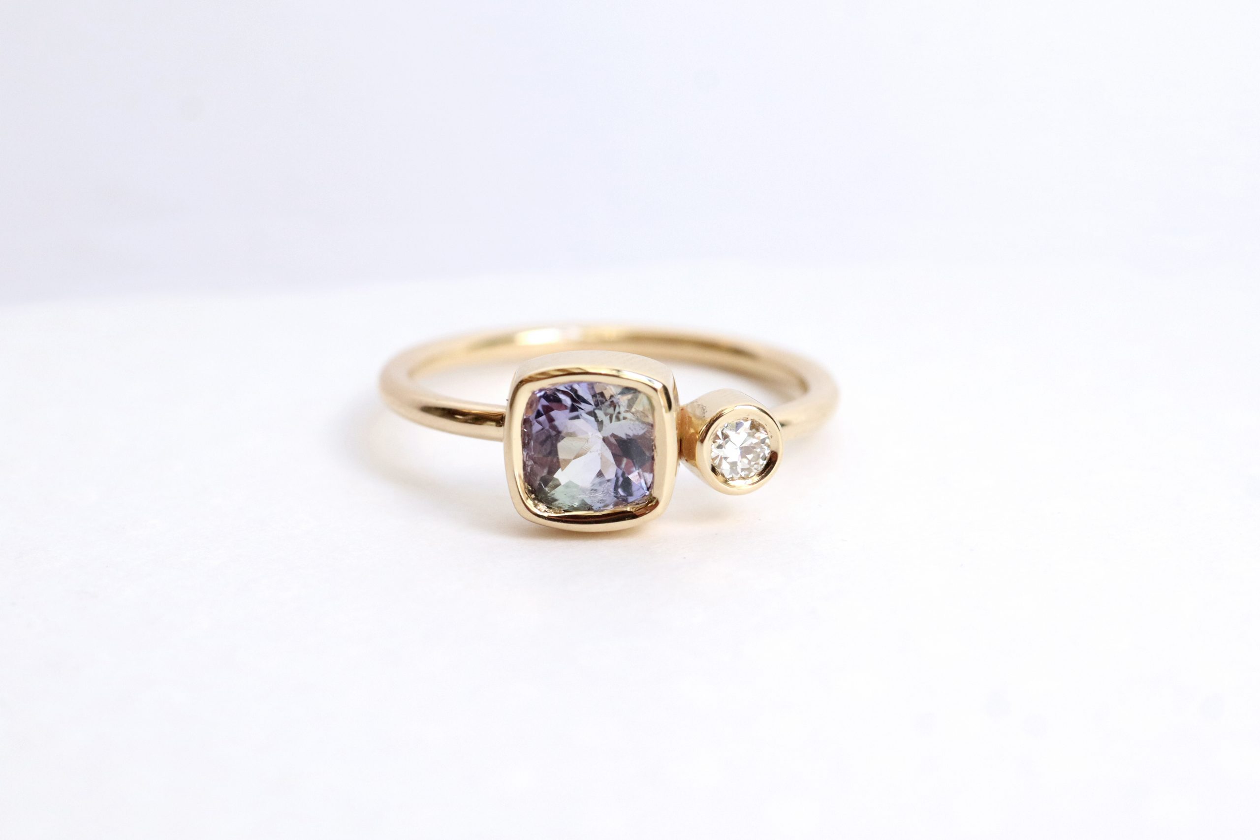 Sa monture épurée et moderne met en valeur une superbe Tanzanite pastel aux couleurs changeantes de 0,89ct, sublimée par un Diamant de 0,065ct et un serti clos qui lui confèrent un charme moderne et intemporel.