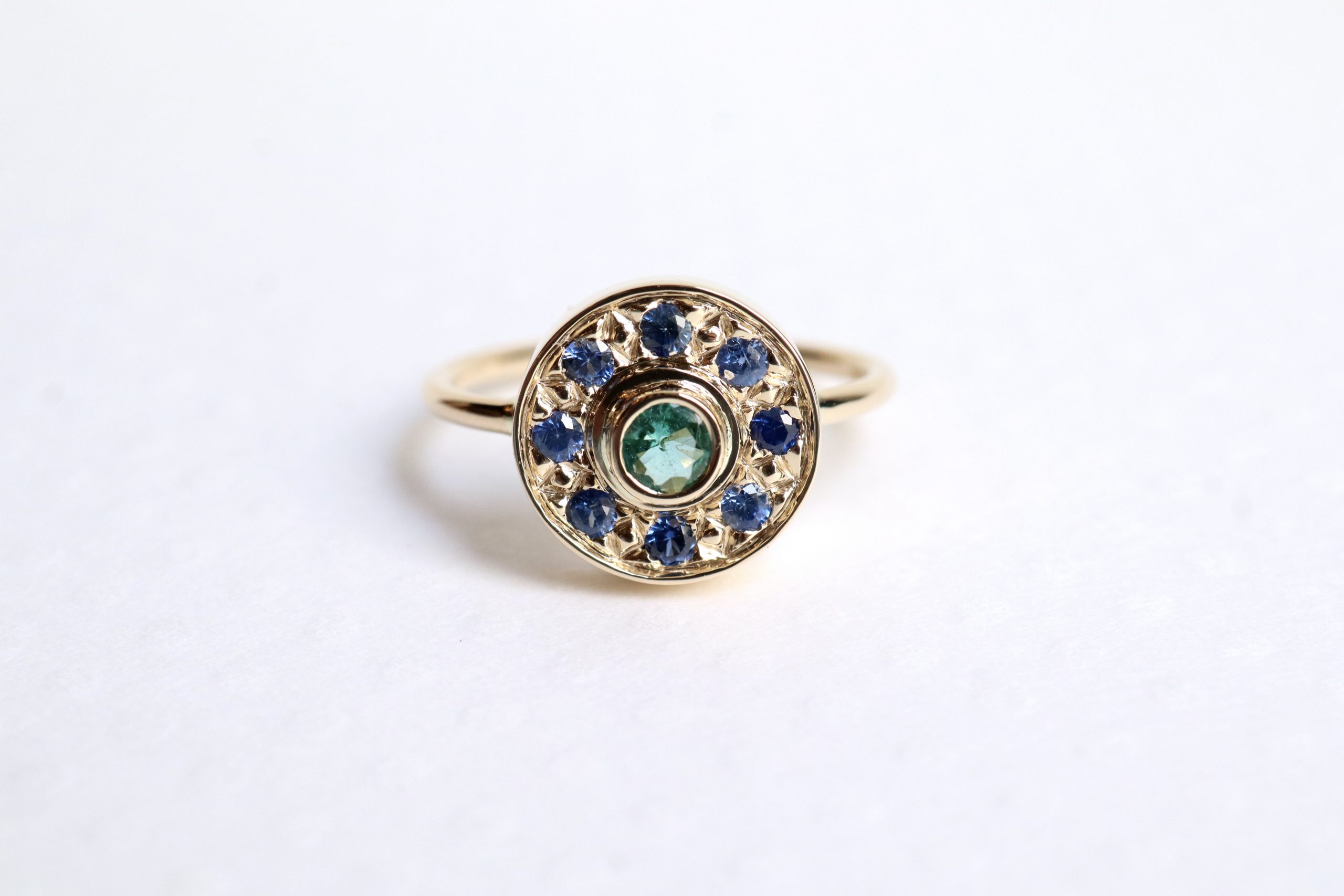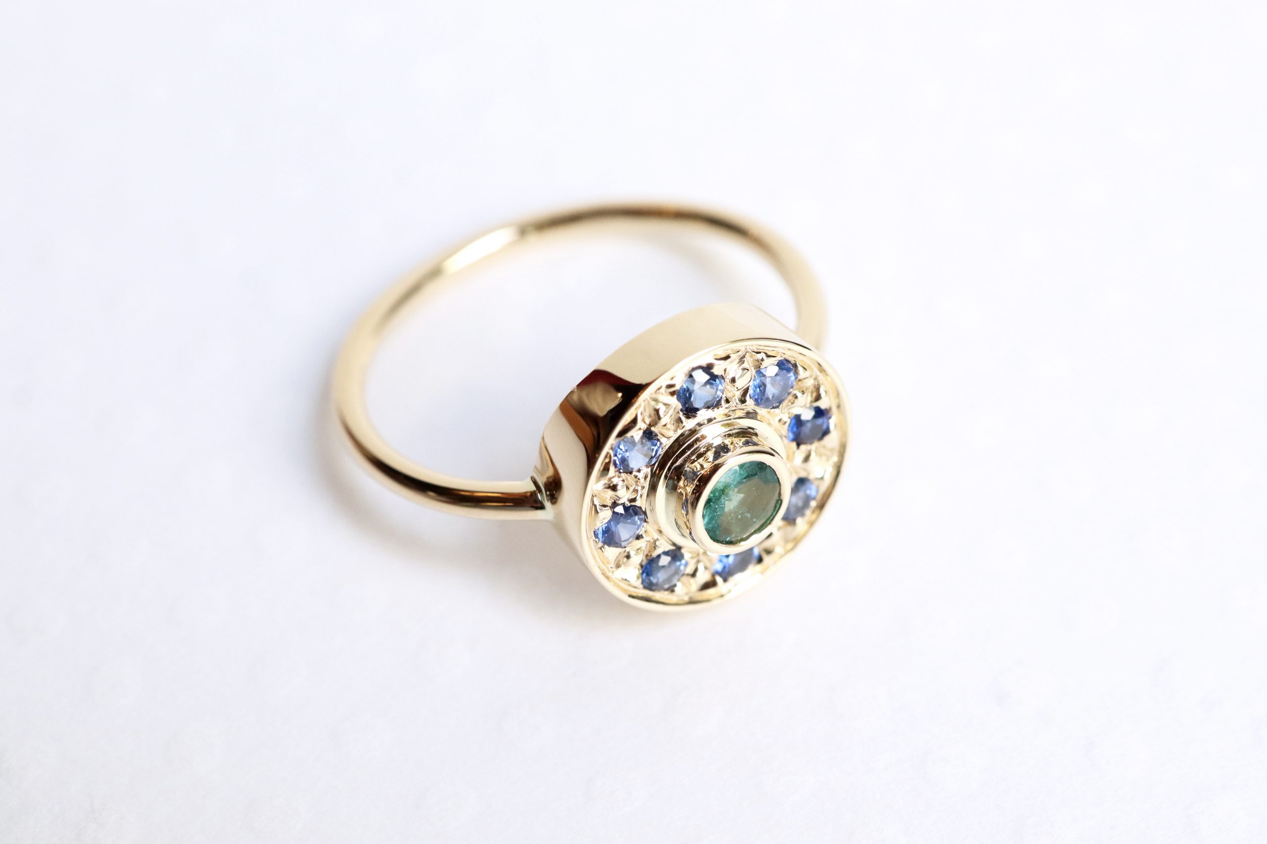 Son anneau fin en fil rond de 1,5 mm met en valeur une émeraude ronde 0,15ct en serti clos, entourée de huit saphirs, sublimés par un serti grain qui lui confère un charme moderne et intemporel.
