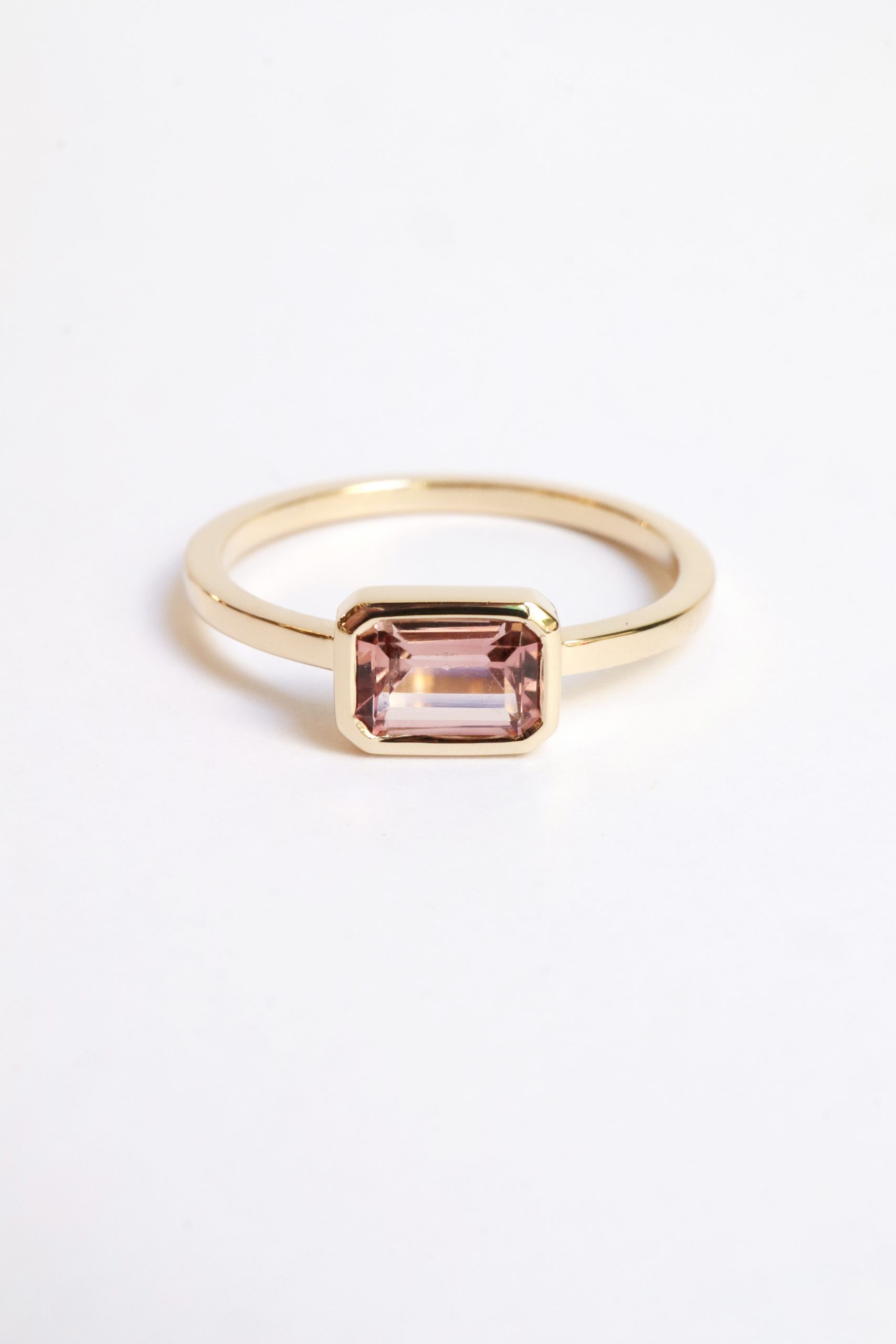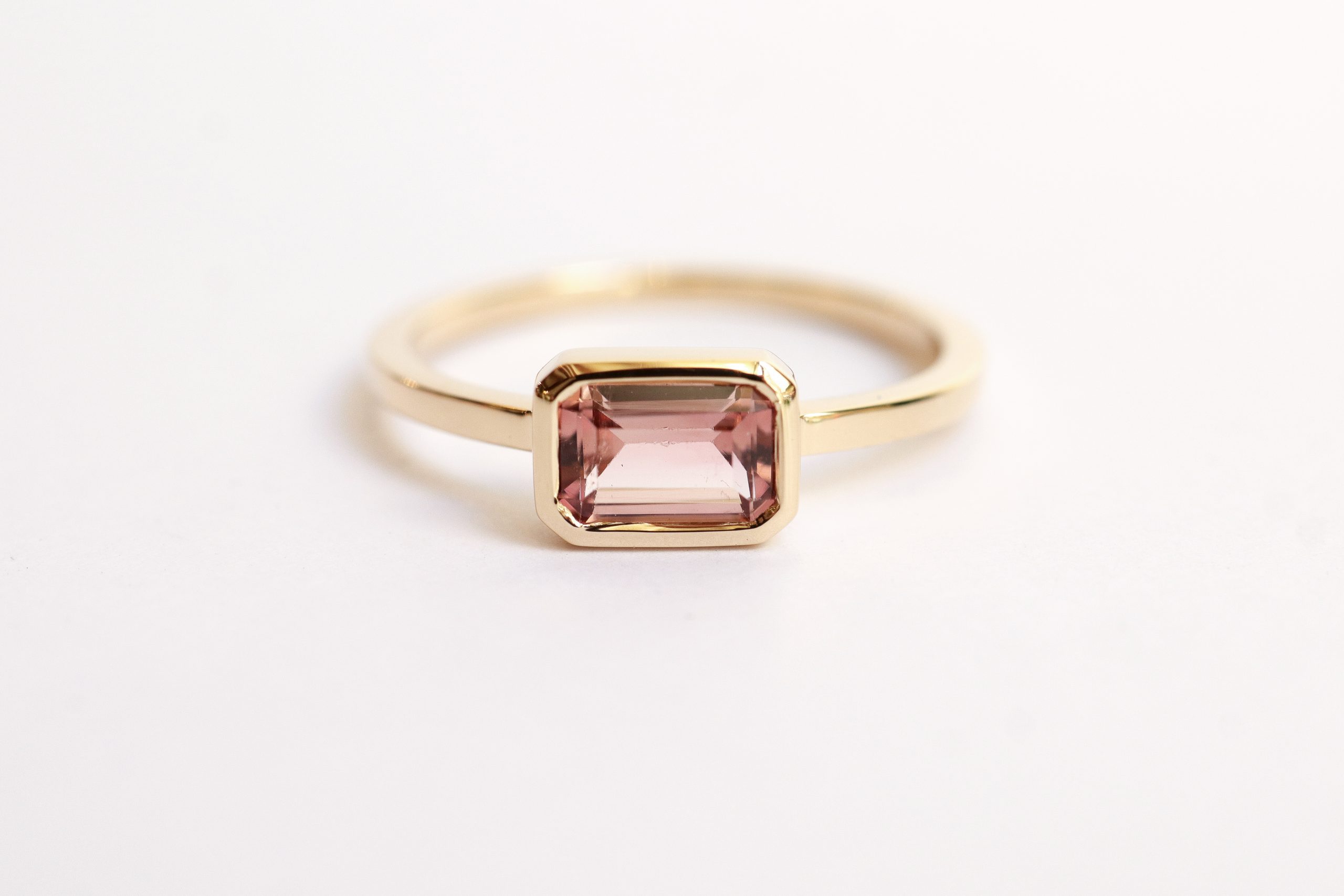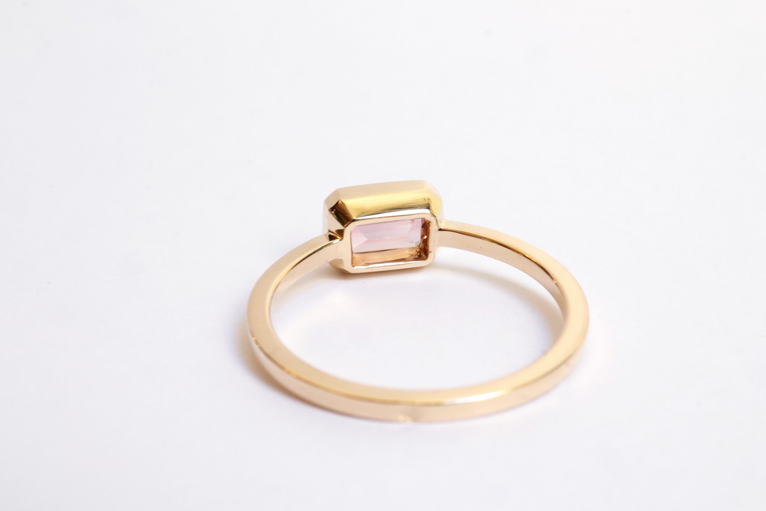 Or jaune 18 carats (750/1000) recyclé et tourmaline rose 0,74 carats, taille RPC, pierre éthique.