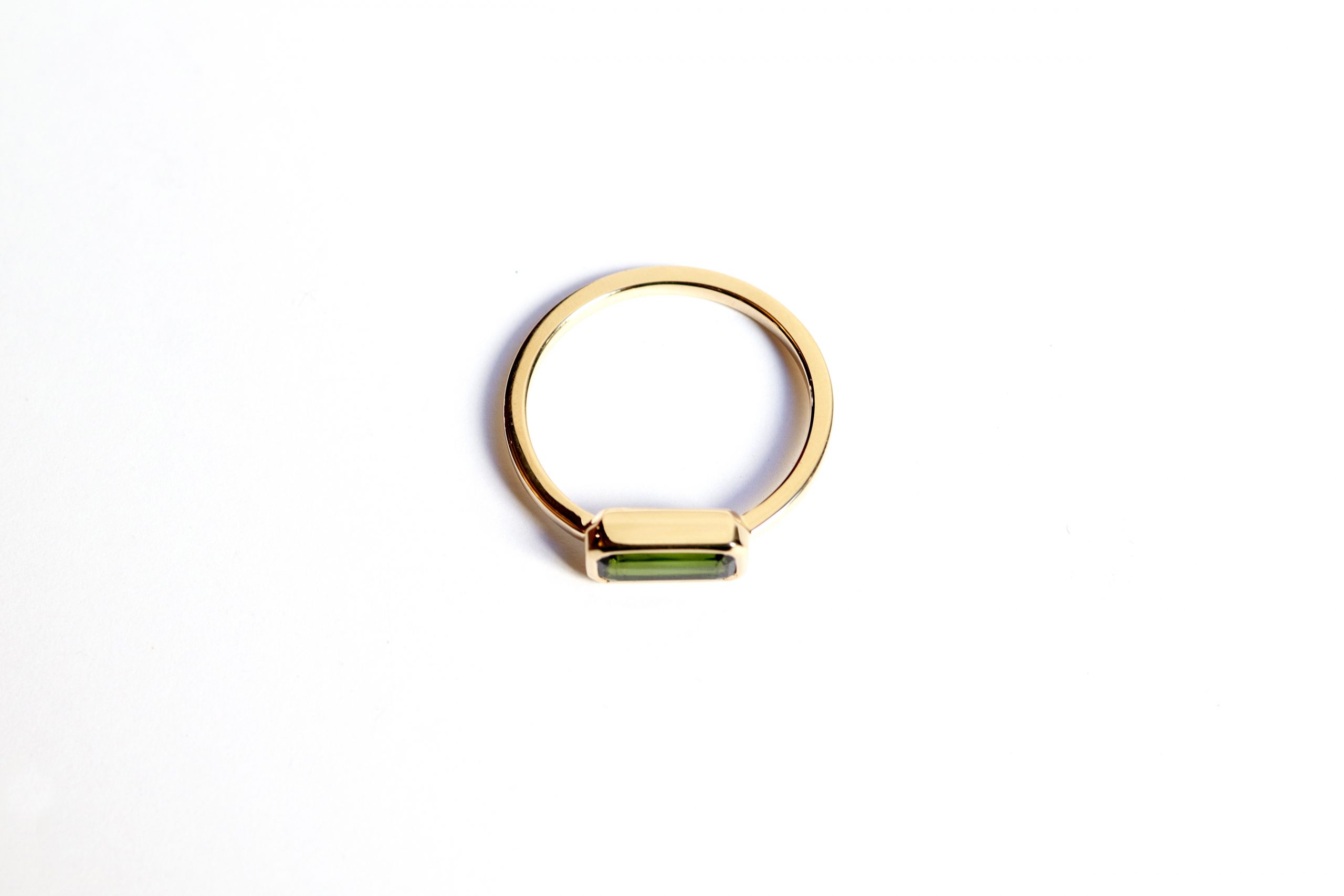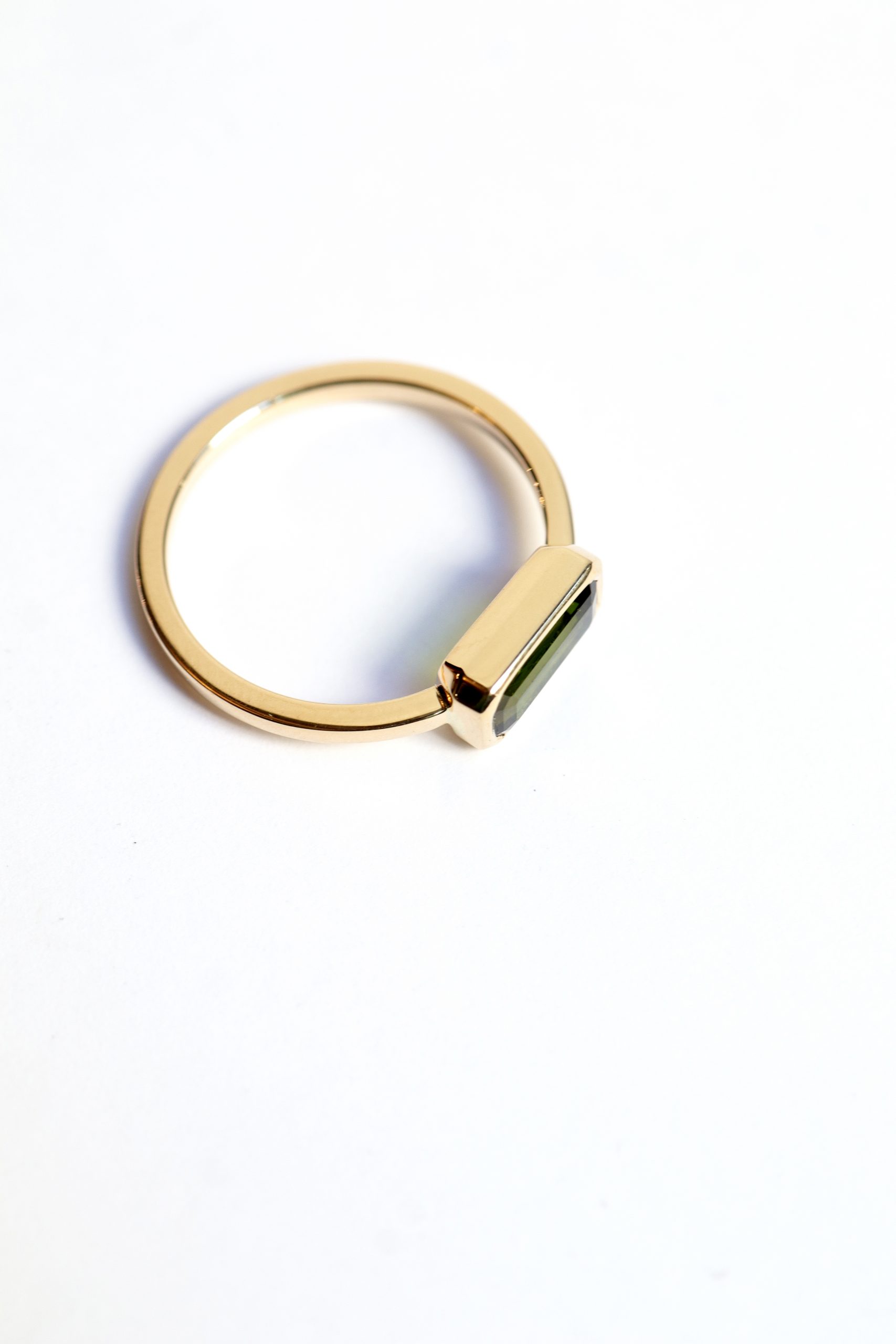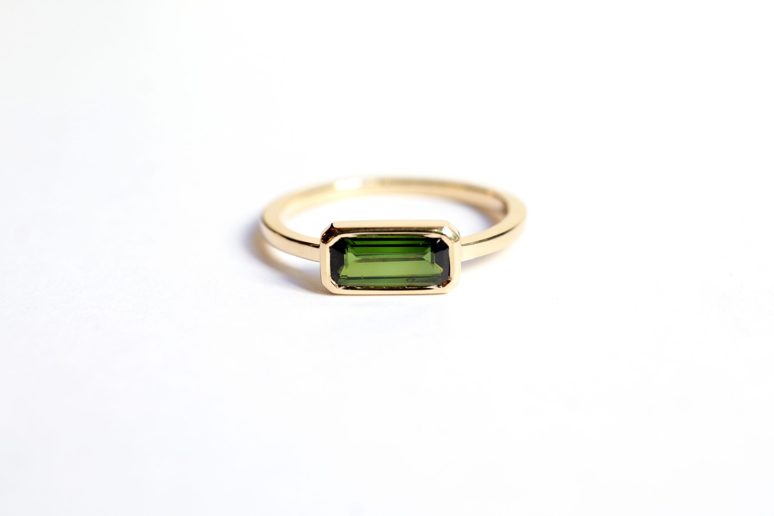 Or jaune 18 carats (750/1000) recyclé et tourmaline verte, 0,89 carats, taille RPC, pierre éthique.