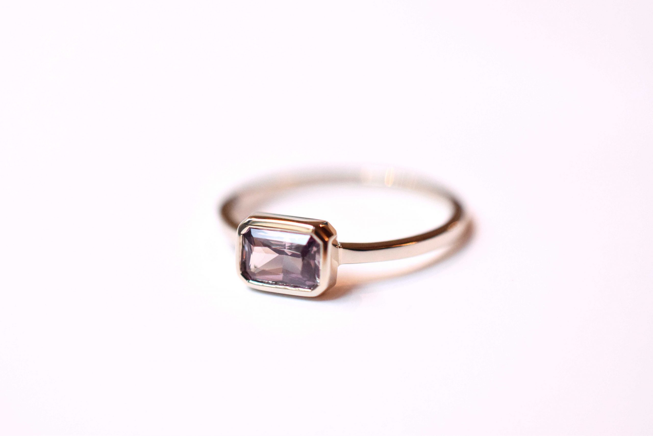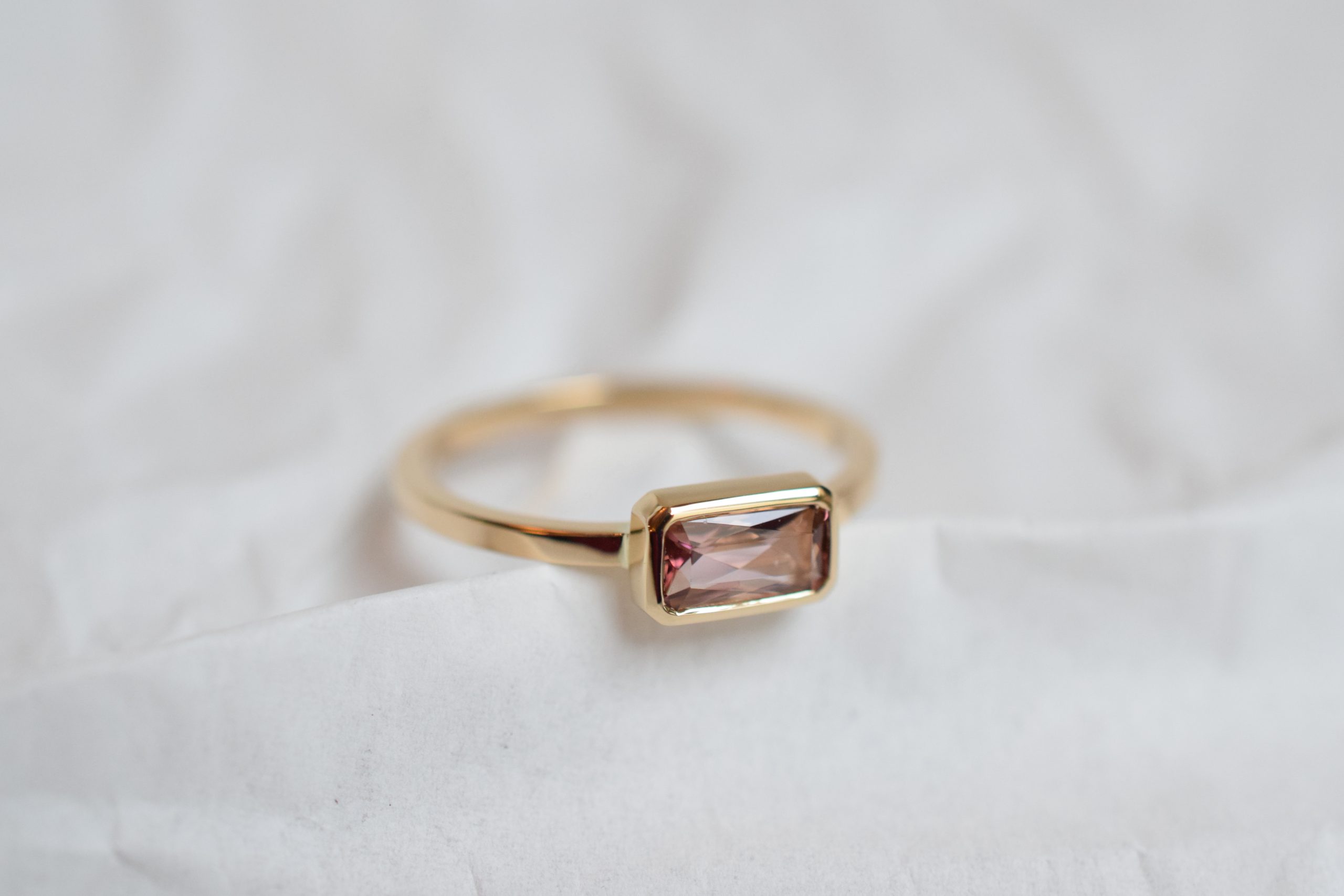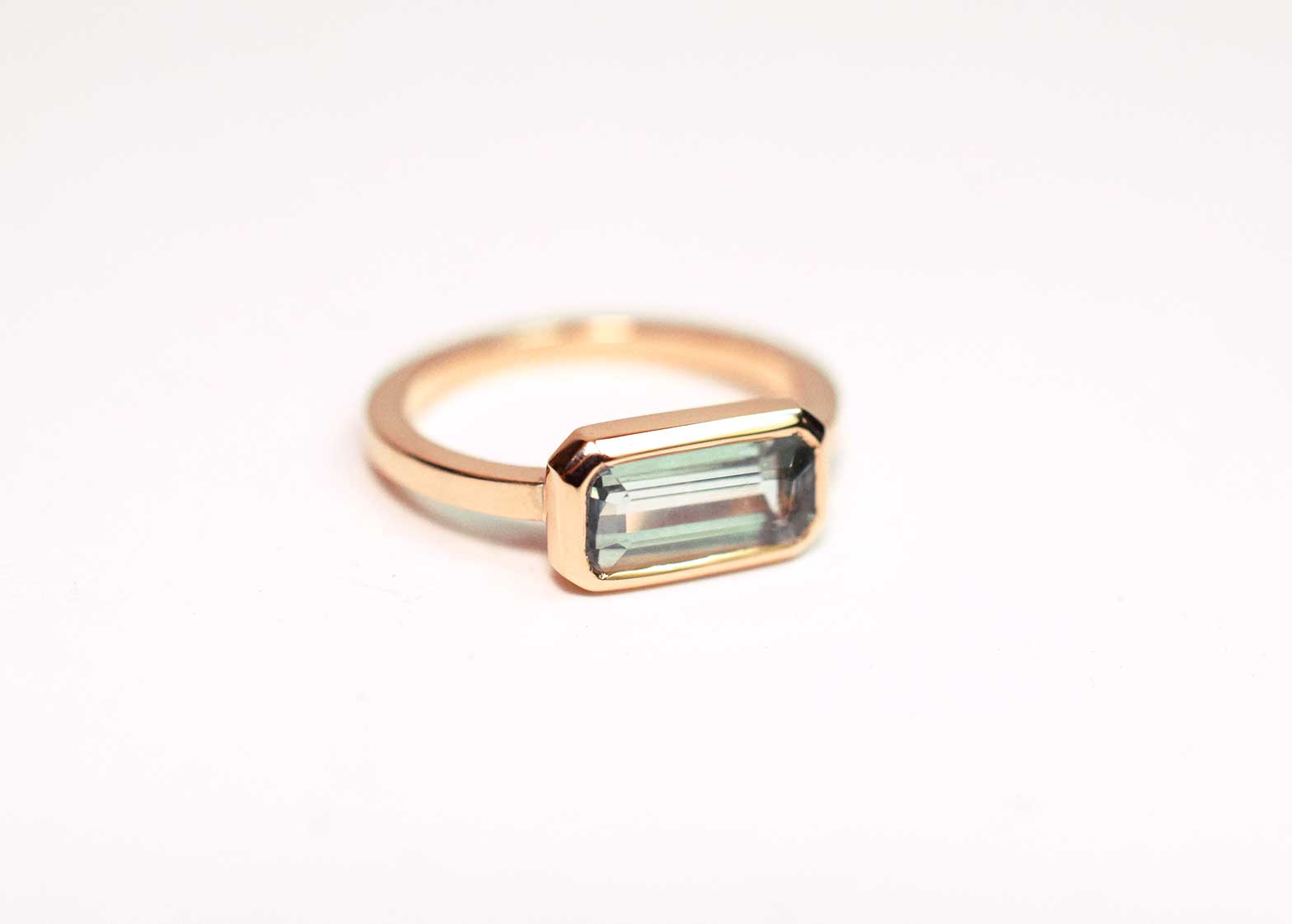 Découvrez notre bague minimaliste en or 750/1000 (18 carats) certifié RJC, pensée pour sublimer une pierre précieuse de taille RPC (rectangle pan coupés) ou taille émeraude, choisie par vos soins.