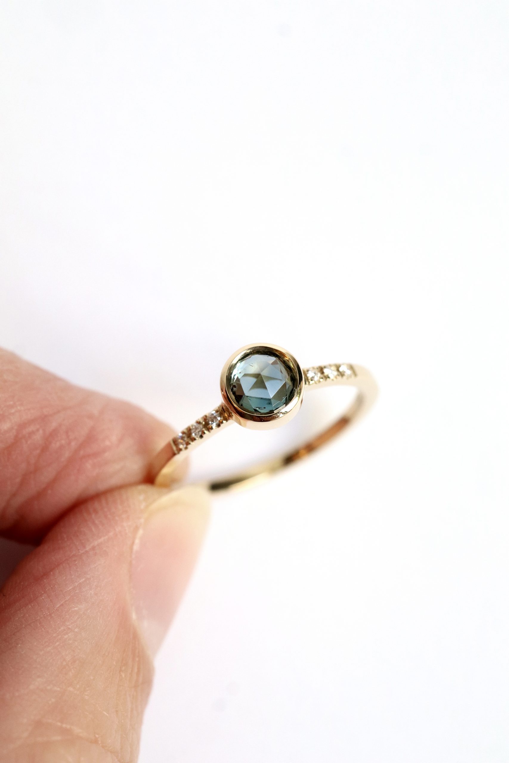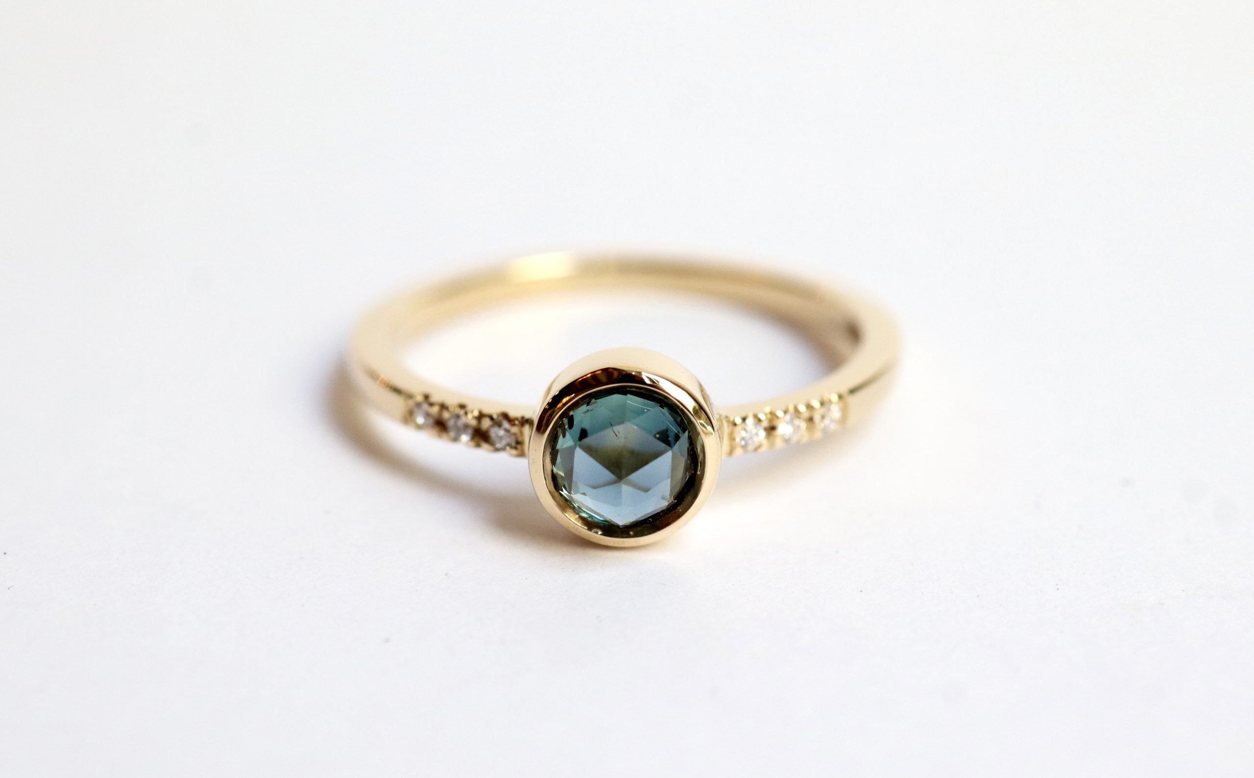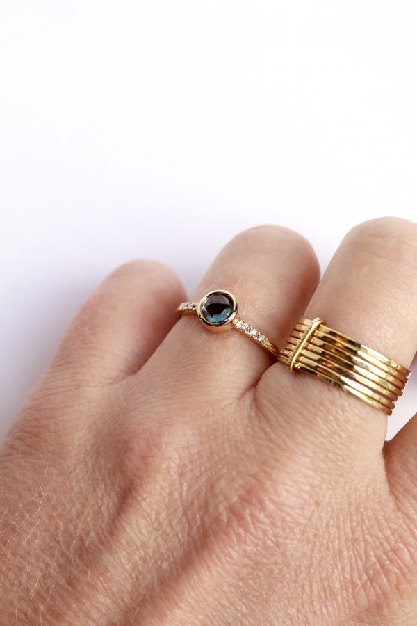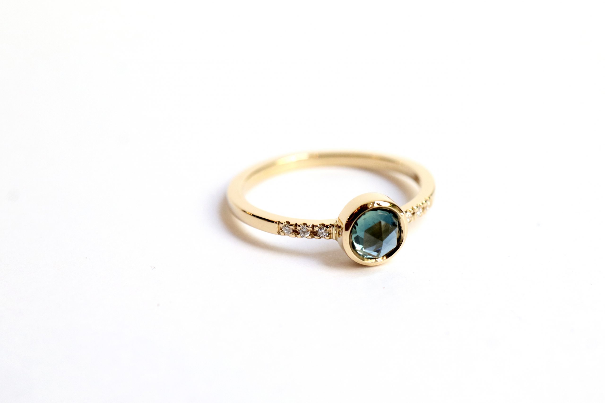 Bague en or jaune 18 ct sertie d’un saphir taille rosecut de 5mm et de 6 diamants GSI.