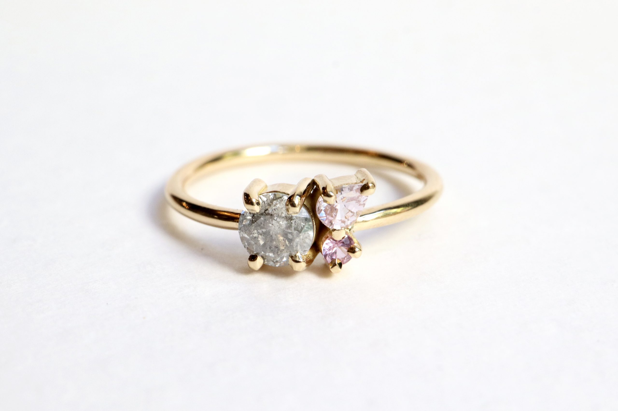 Sa monture épurée et moderne met en valeur un superbe Diamant Poivre & Sel de 0,51ct, accompagné de deux Saphirs roses de 0,155ct et 0,05ct et un serti griffe qui lui confèrent un charme classique et intemporel.