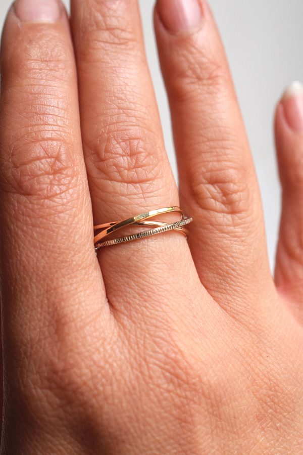 La bague Trois Ors incarne l’harmonie entre trois couleurs d’or, créant un effet visuel captivant et dynamique. Chaque anneau peut être choisi avec une texture différente – martelé, ciselé ou lisse – selon vos préférences, apportant à chaque couleur d’or une brillance unique et une profondeur qui capte la lumière de manière subtile. Ce design moderne et élégant symbolise l’union de trois éléments différents, tout en restant parfaitement équilibré.