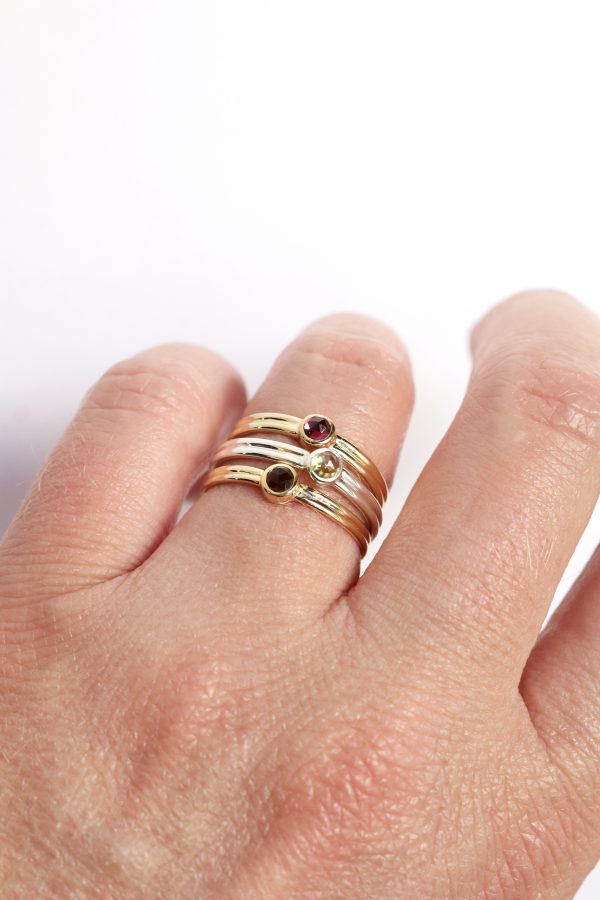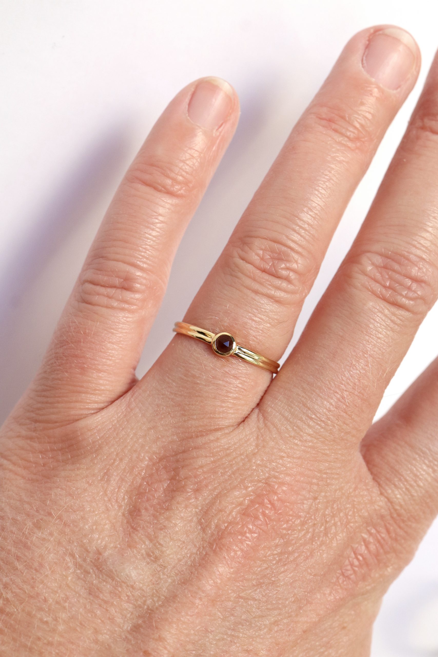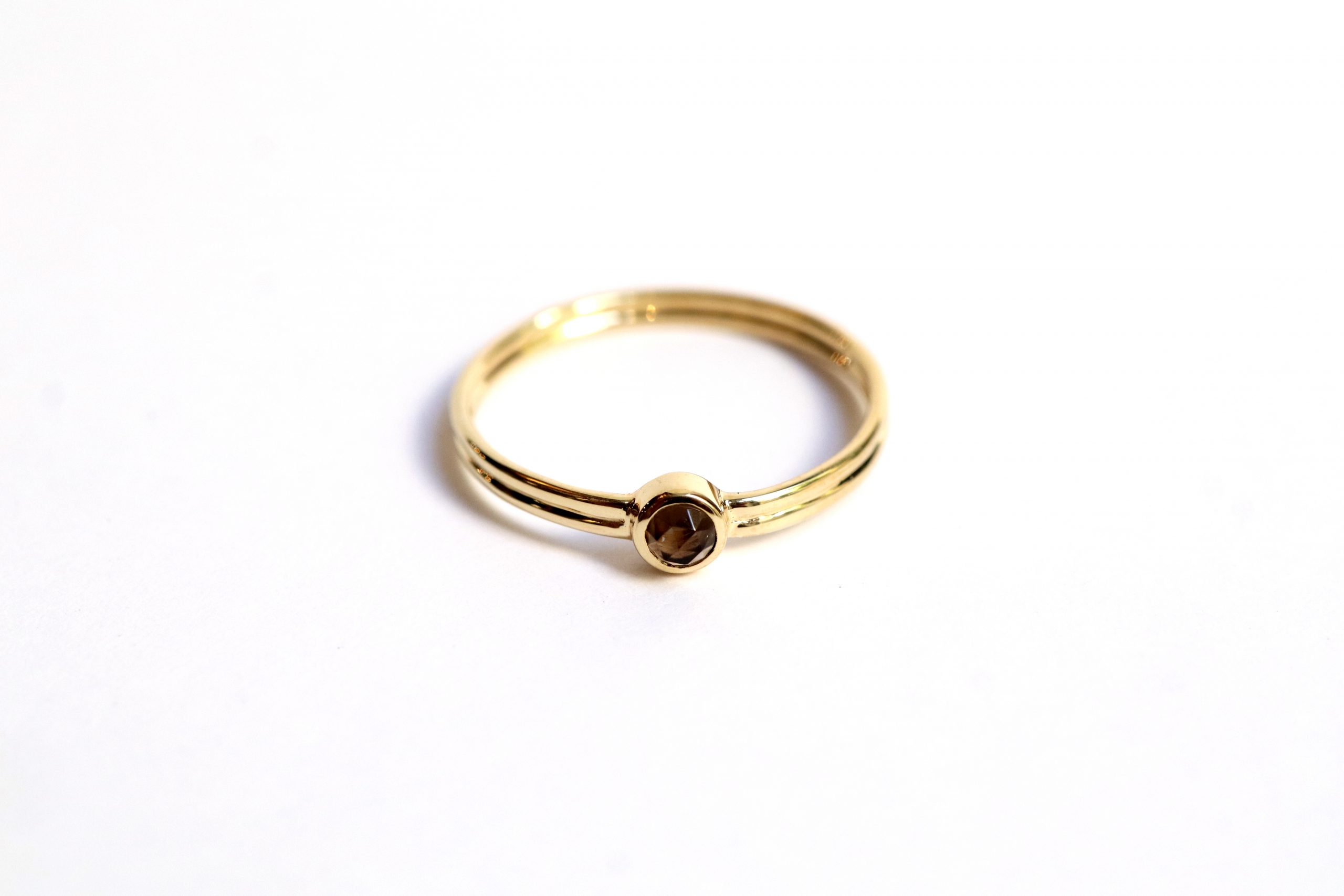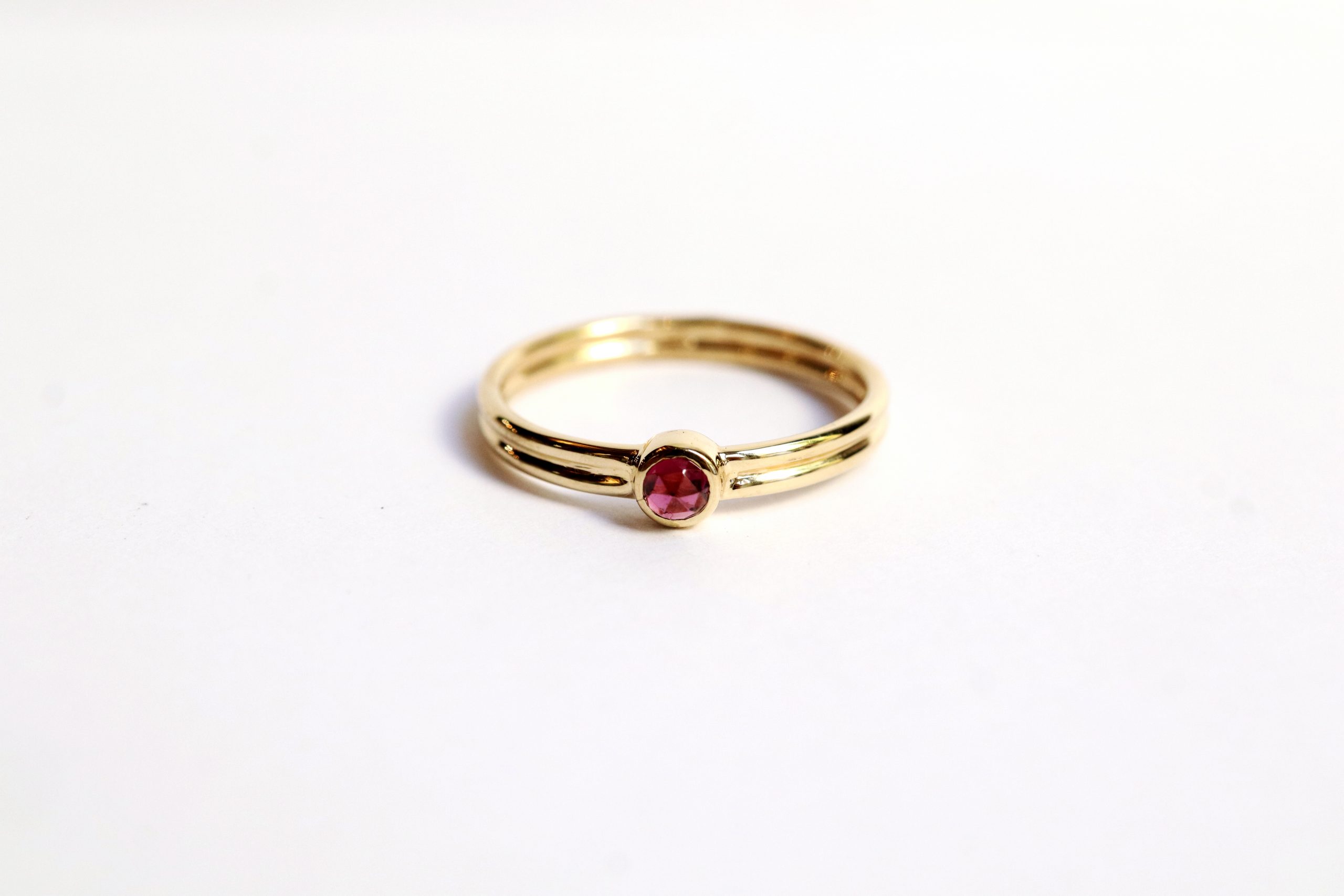 La bague est composée de deux fils soudés ensemble d’une épaisseur totale de 2,4mm, un serti clos vient mettre en valeur une pierre de couleur taille ancienne appelée « rosecut ». Elle possède une style très moderne grâce au minimalisme de son design. Fine et élégante à porter seule ou en accumulation.