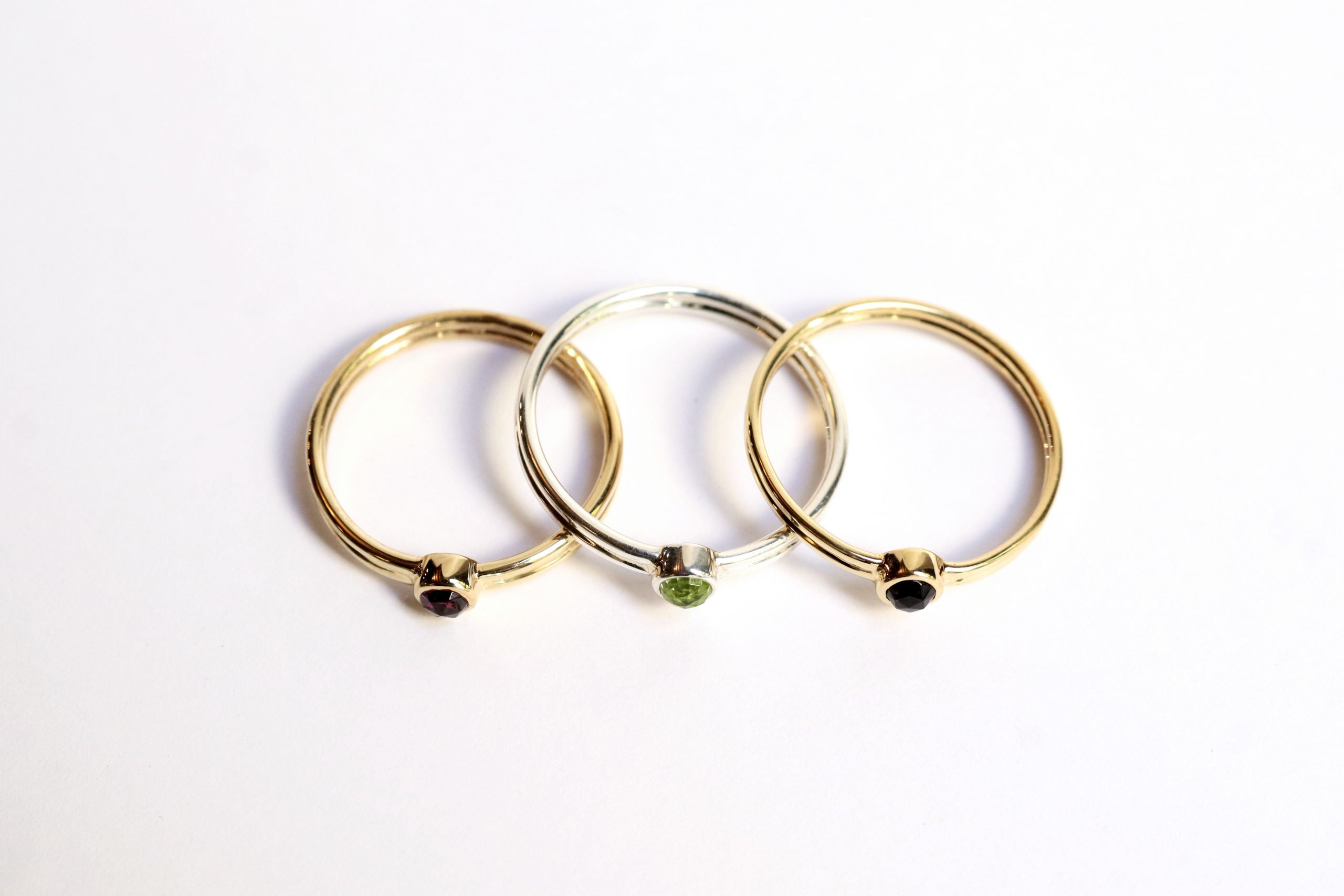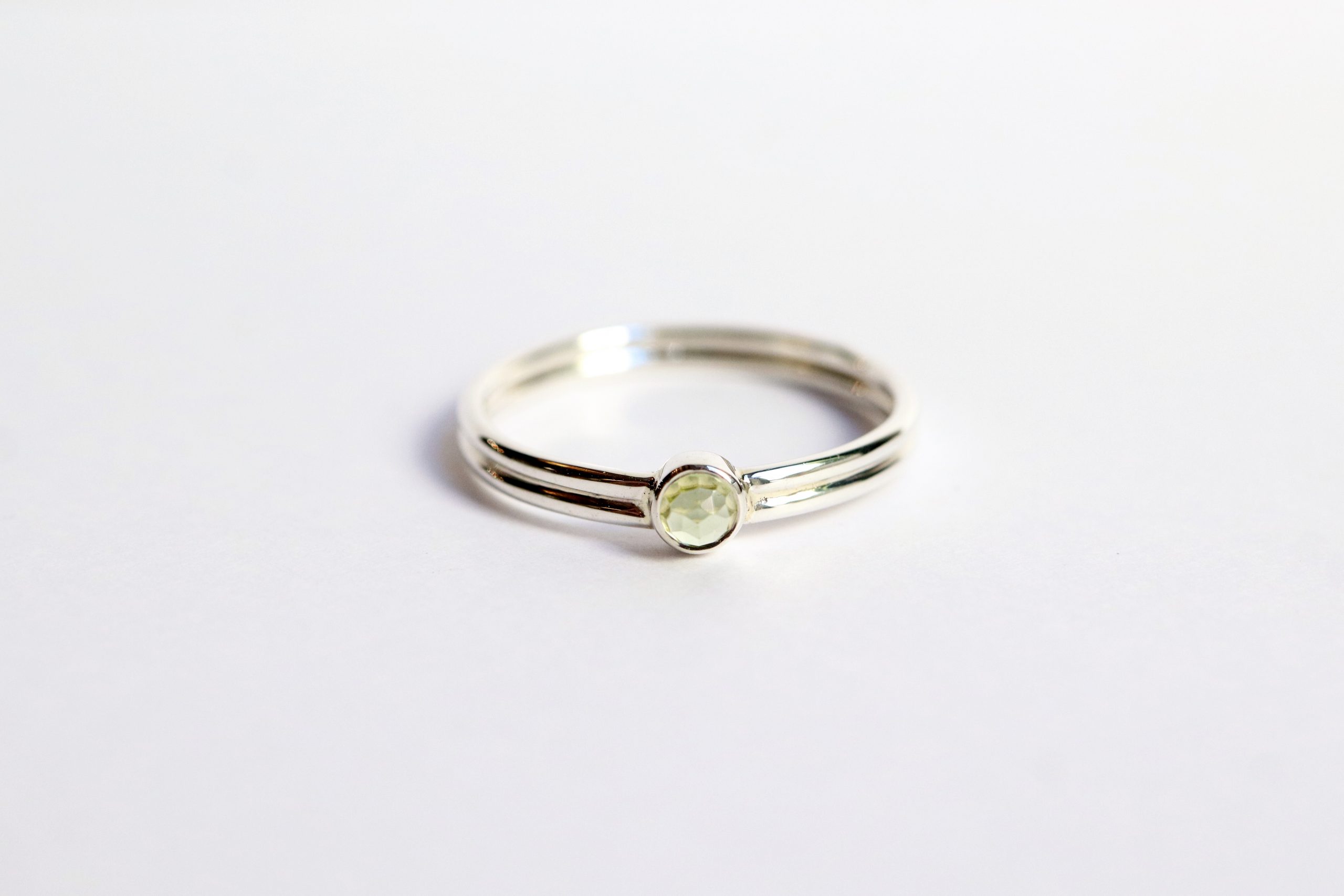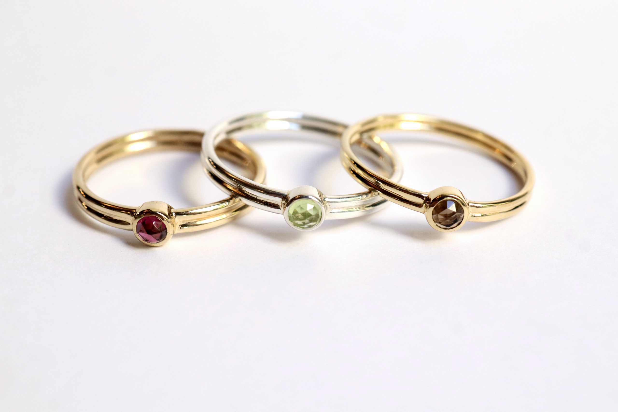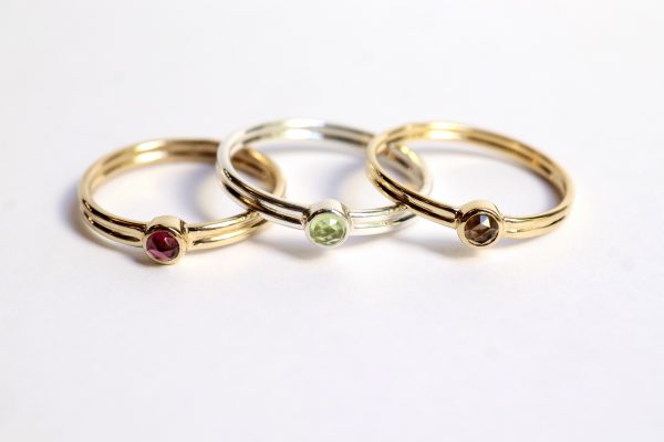 La bague est composée de deux fils soudés ensemble d’une épaisseur totale de 2,4mm, un serti clos vient mettre en valeur une pierre de couleur taille ancienne appelée « rosecut ». Elle possède une style très moderne grâce au minimalisme de son design. Fine et élégante à porter seule ou en accumulation.
