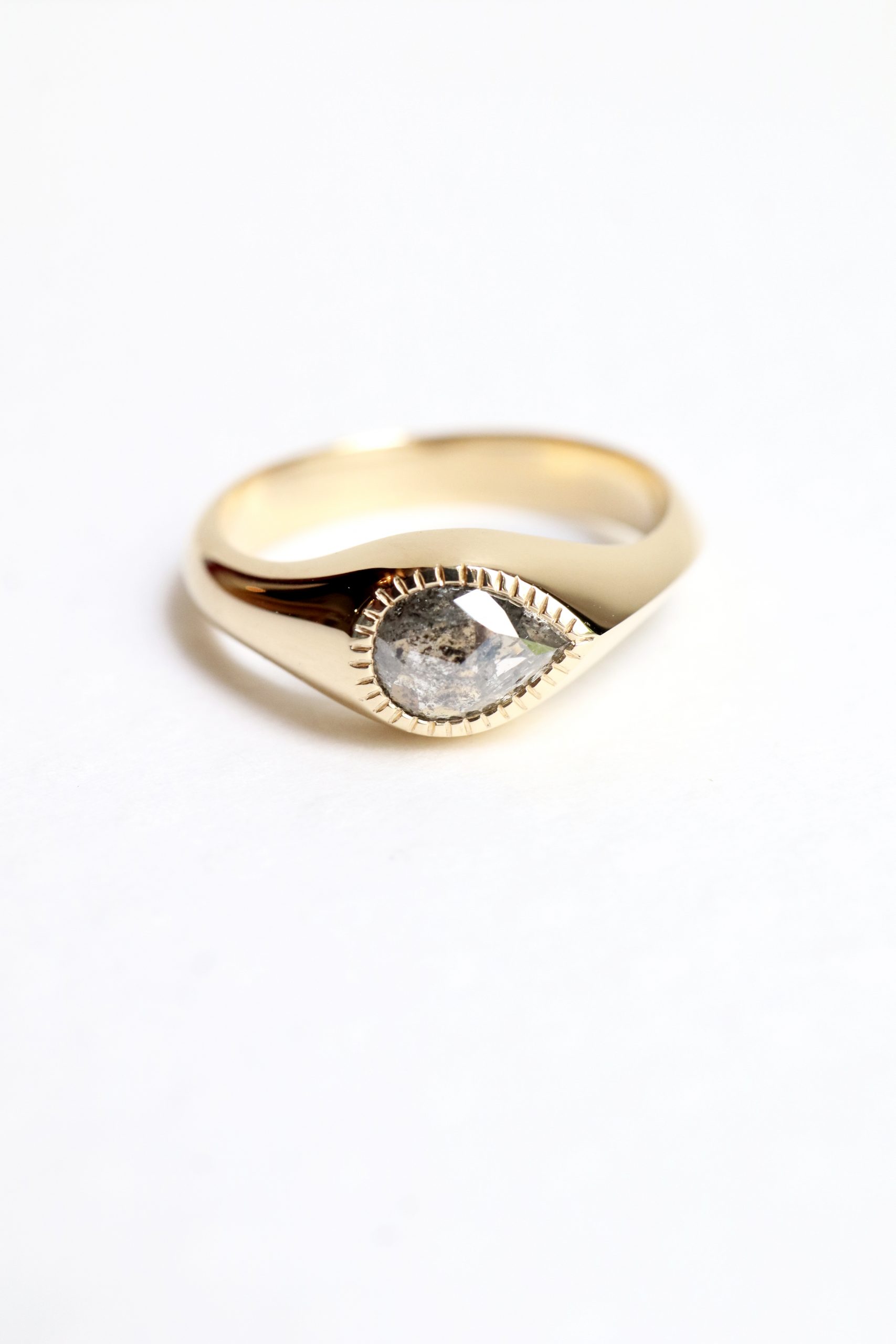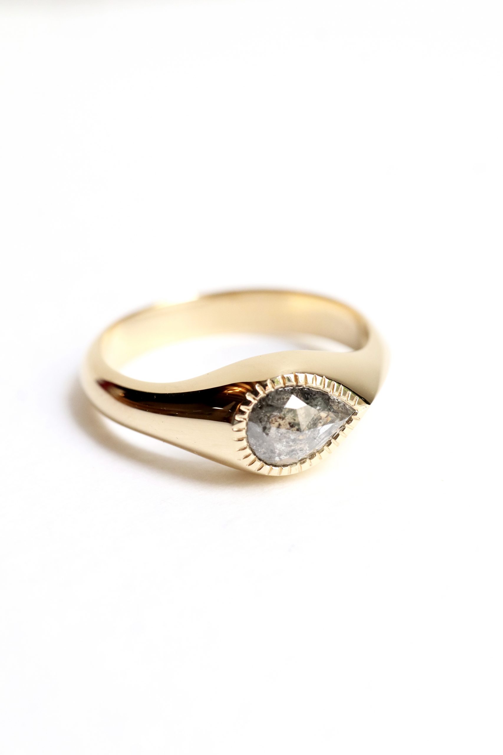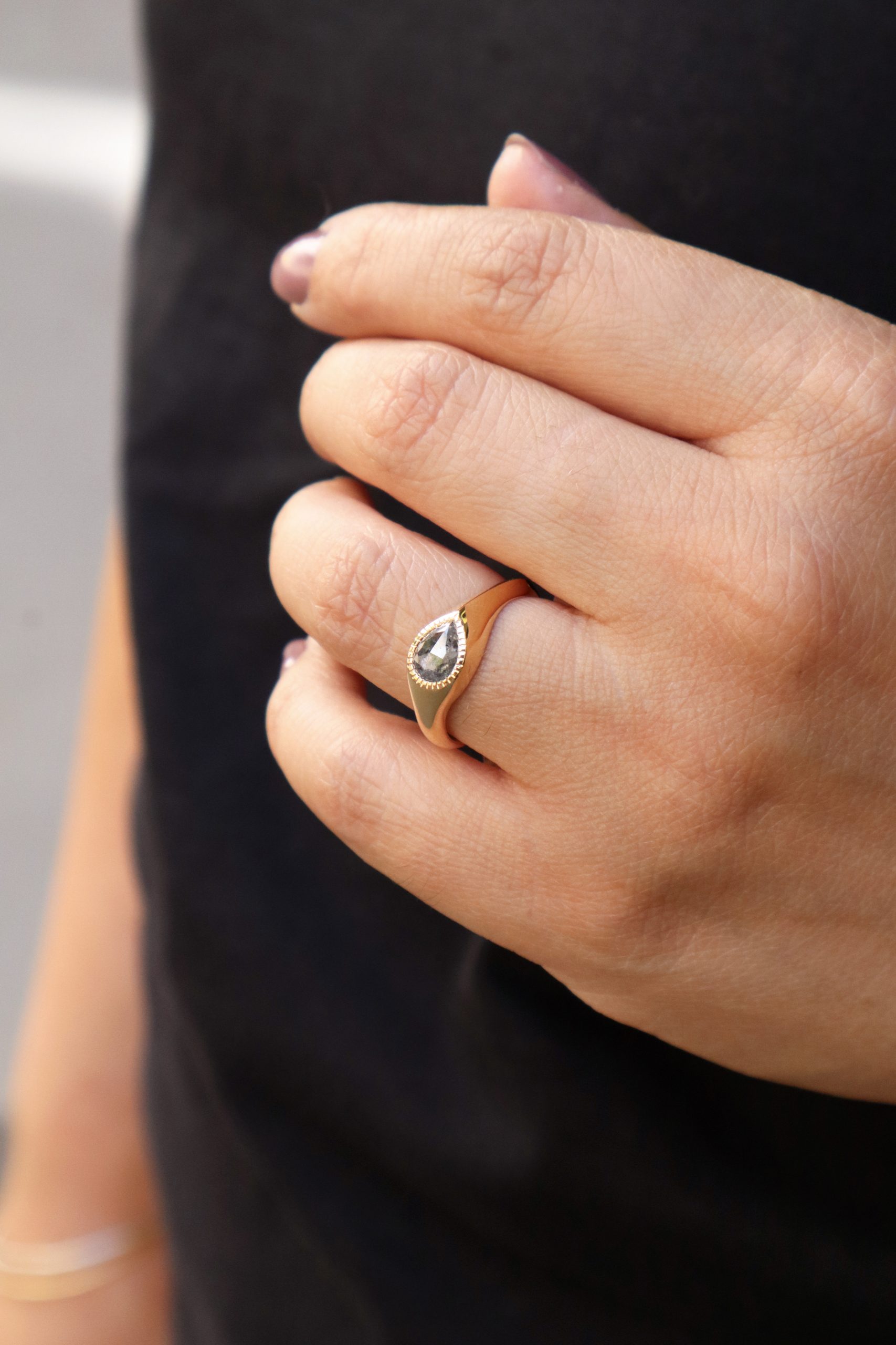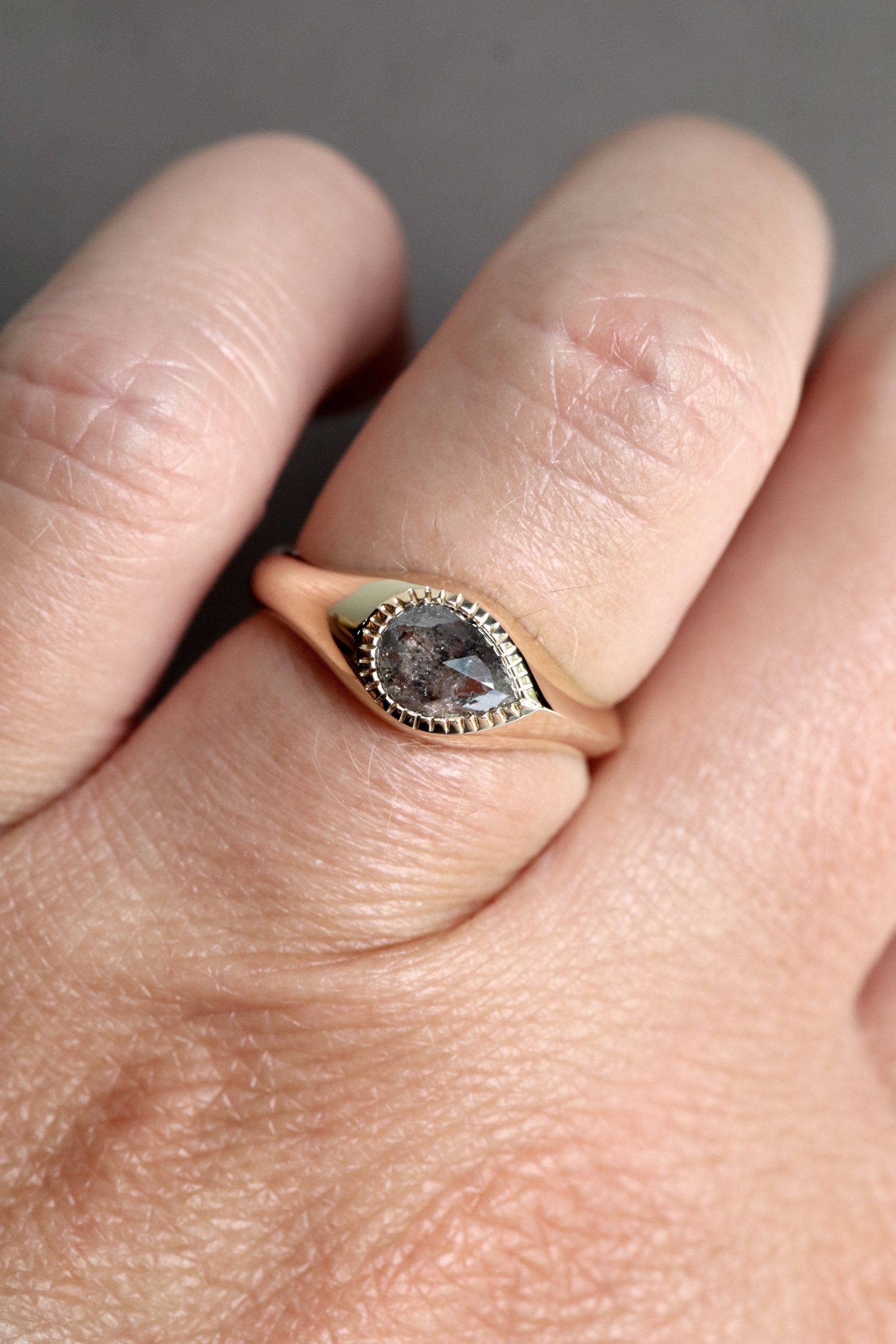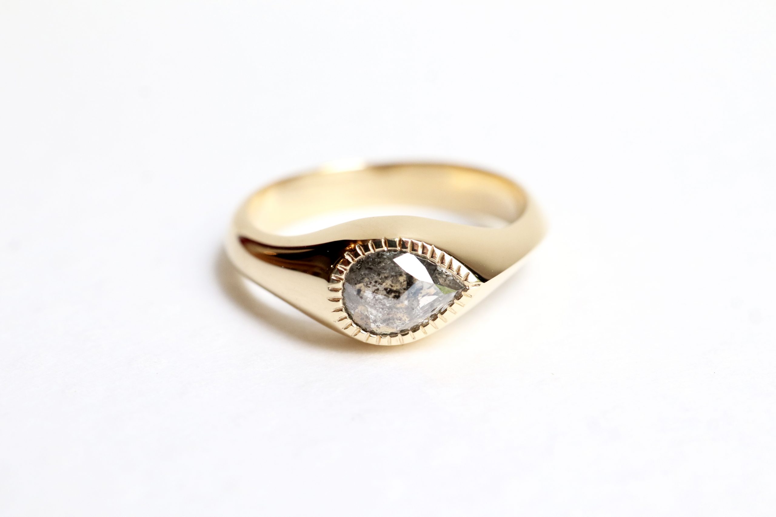 Le diamant poivre & sel est une pierre naturelle dont les inclusions de graphite lui confèrent une teinte grisée nuancée, rendant chaque gemme absolument unique. Sa taille poire optimise son éclat en captant magnifiquement la lumière tout en apportant beaucoup d’élégance à l’ensemble du bijou. Chaque pierre est différente, ce qui fait de votre bague un modèle singulier et exclusif.