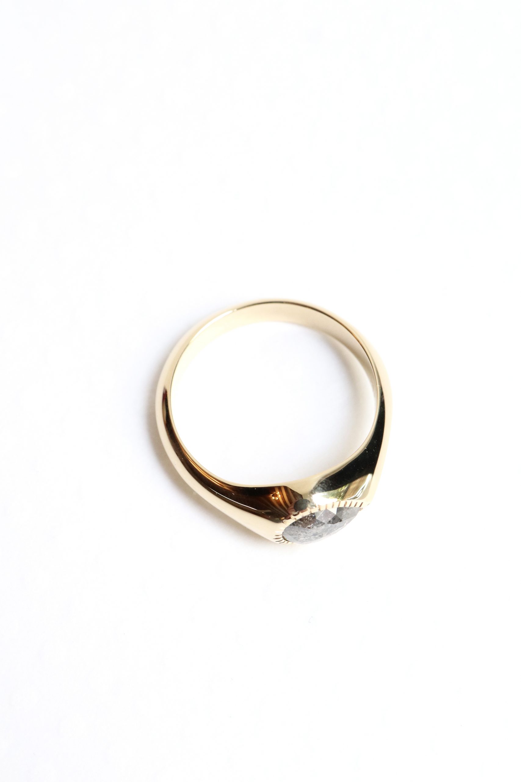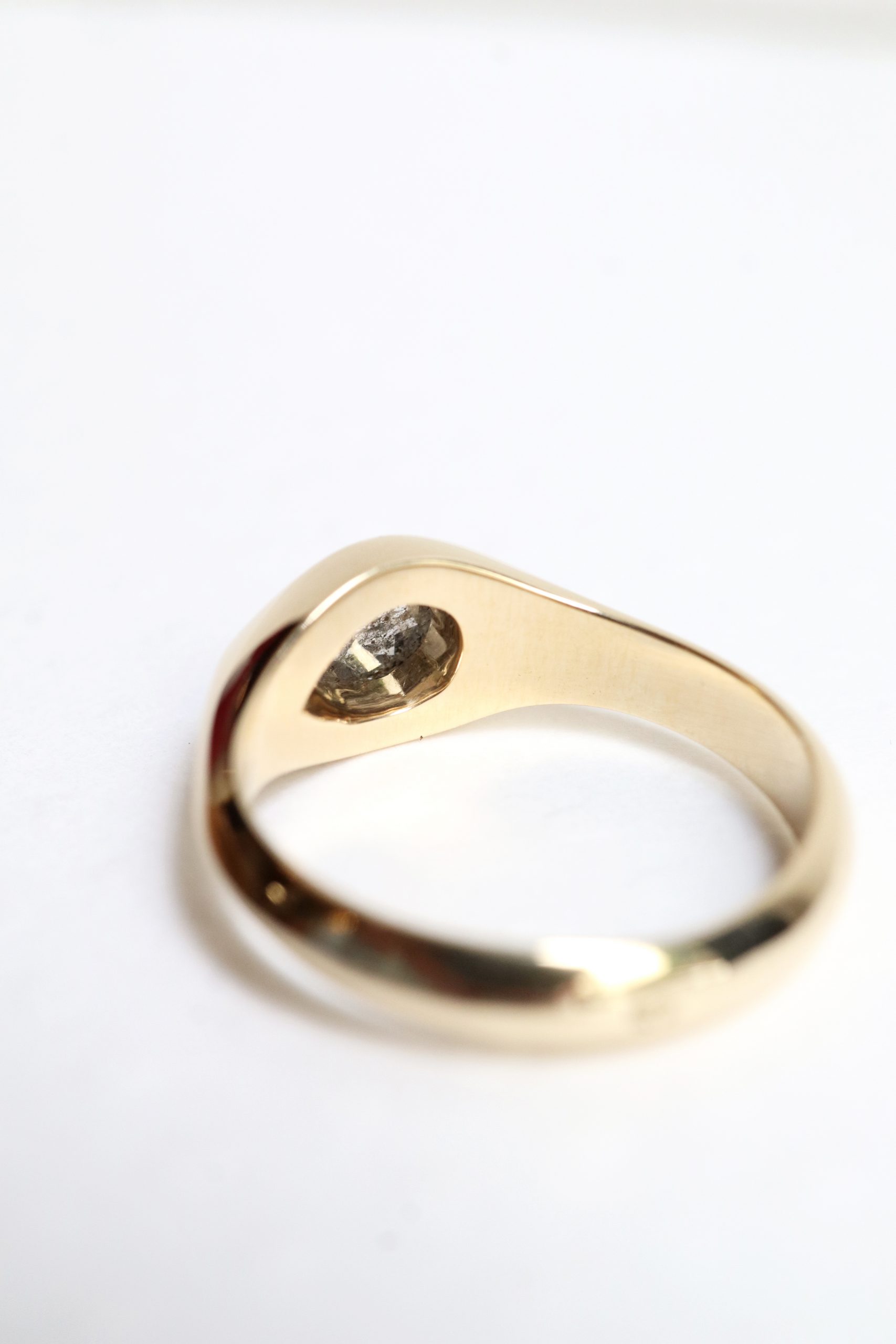 Sa monture asymétrique met en valeur un superbe diamant poivre & sel taillé en poire de 0,59ct, sublimé par un serti clos ciselé qui lui confère un charme moderne et intemporel.