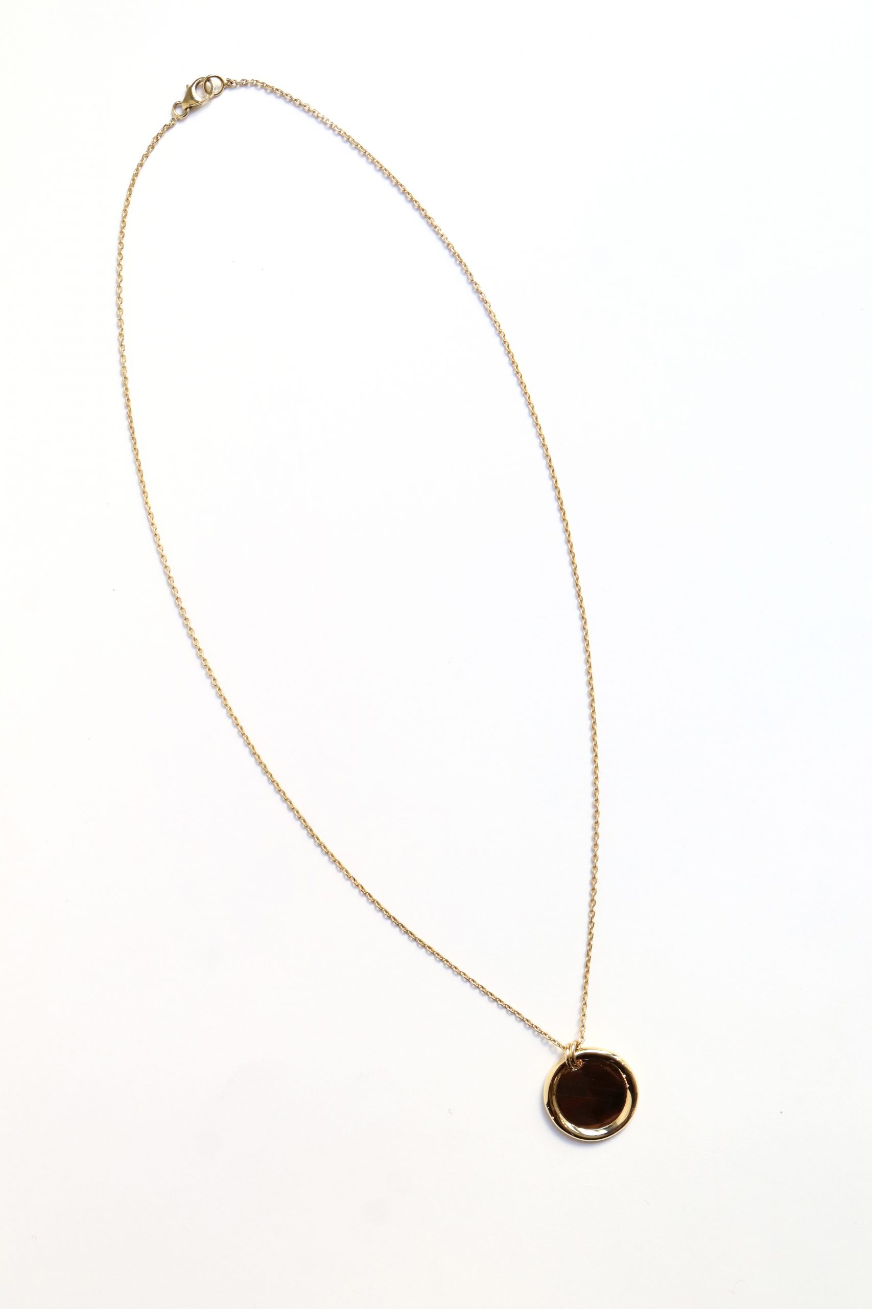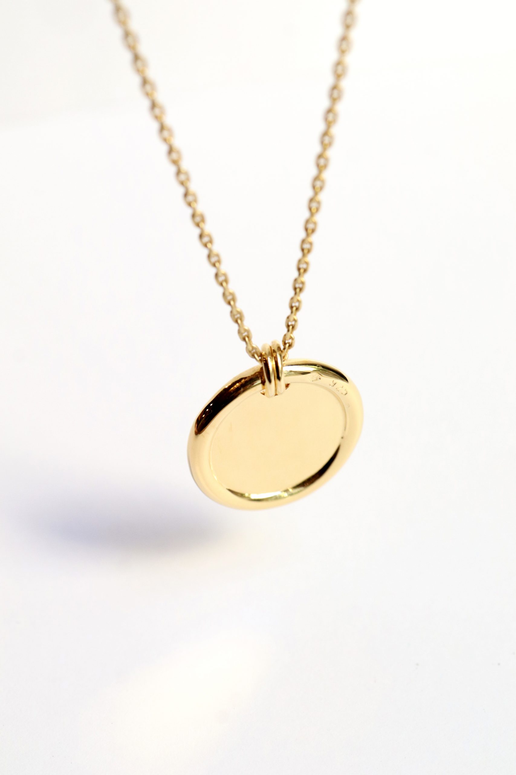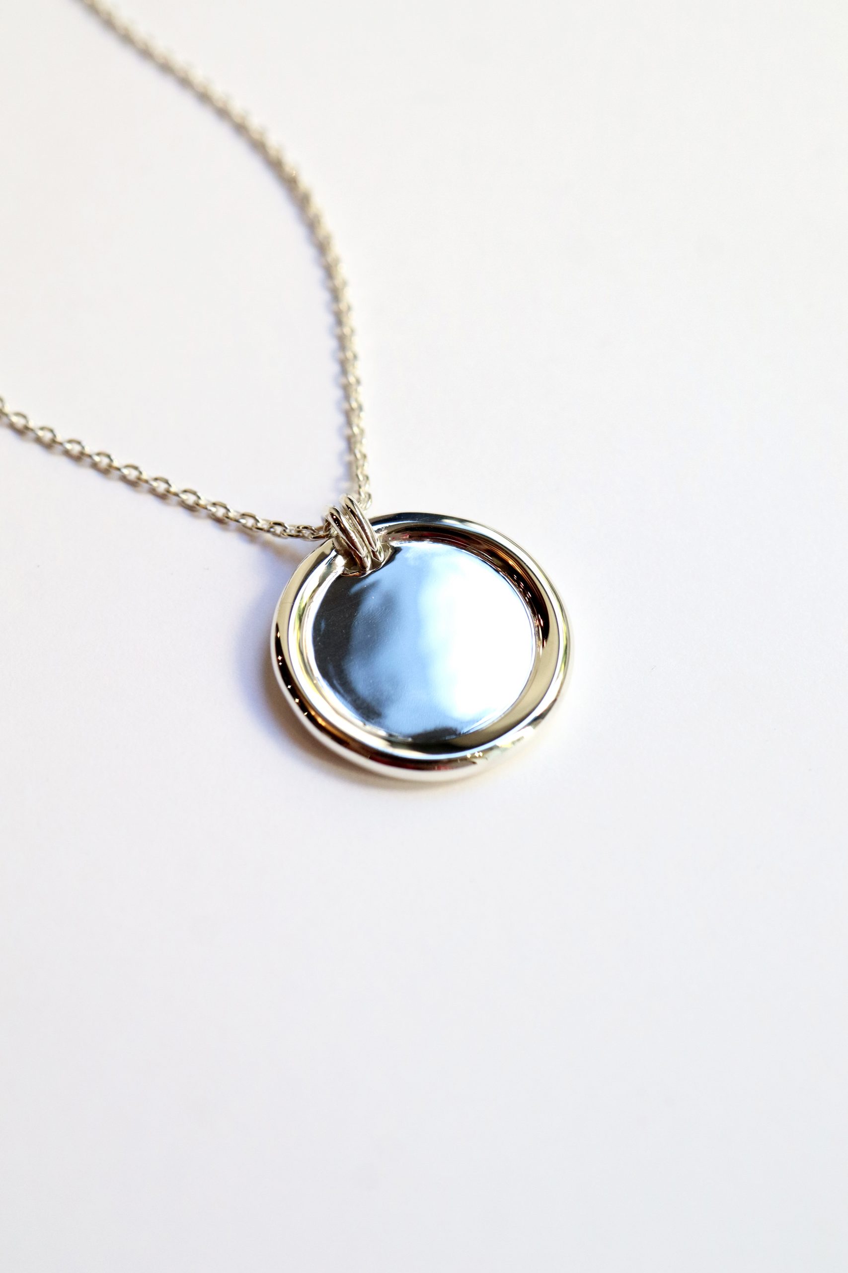 Ce collier en argent 925 ou vermeil se compose d’une fine chaîne et d’une médaille ronde au poli miroir, cerclée d’un anneau lisse qui capte la lumière avec douceur.